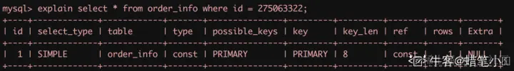 这里简单介绍下其使用方式,通过在所执行的 SQL 前加上 explain 就可以来分析当前 SQL 的执行计划: