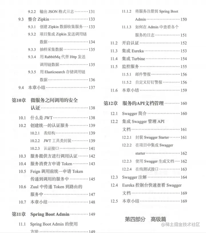 这部分以案例的形式对微服务架构中经常会遇到的问题进行了详细讲解,涵盖分布式配置管理、Sleuth服务跟踪、微服务间调用的安全认证、Spring Baat Admin、服务的API文档管理等多个主题。