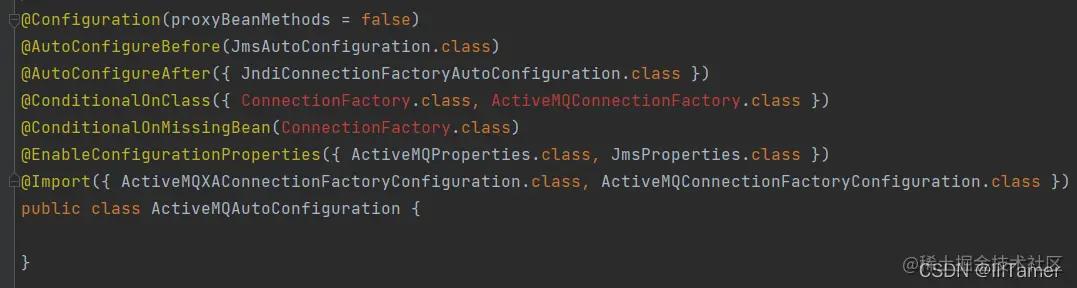 大致意思为使用此注解配置的,标注了 @ConfigurationProperties 注解的类,将会以标注化的形式注册成为 Bean。即该注解起到便于统一注册与标识特定配置类的作用。基于上述我们不难猜测,在 @EnableConfigurationProperties 注解中配置的 ActiveMQProperties.class 与 JmsProperties.class 类上都打上了 @ConfigurationProperties 注解(且无 @Component 注解)