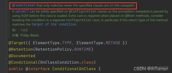 Conditional 意“有条件的”,不止这两个。在 org.springframework.boot.autoconfigure.condition 包下有许许多多其它的 ConditionOnXx 注解,通过翻看源码的注释我们可以得知,当且仅当被 @Configuration 标注的配置类满足所有 @ConditionalOnXx 注解(有的是环境中存在对应类,有的是环境中存在对应Bean),该配置文件类才会被加载到容器中,以下以 @ConditionalOnClass 为例(红框内容:仅指定的类存在于类路径中时匹配条件红框内容:仅指定的类存在于类路径中时匹配条件):