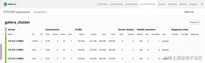进行此配置后,NGINX Plus 仪表盘就可以在端口 8080 上使用了。在下面的屏幕截图中,我们可以看到三个 MySQL 服务器,每个服务器都显示了许多进行中连接的详细信息和当前的健康状况。可以看出,监听 33062 端口的节点以前曾短暂中断过 18.97 秒(在 DT 列列出)。