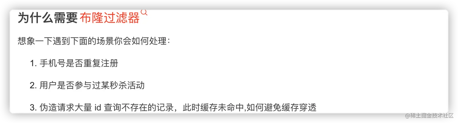 针对上述问题,如果我们直接任由请求访问数据库,问题1、2 还行,如果是问题3,那数据库大抵要说栓Q了。既然如此,我们结合刚刚看到的 布隆过滤器 正好是用来判断一个元素是否存在集合中。而且它的优点就是 空间效率、查询时间都比别人要好的多。那不得看看他到底是咋好的撒。