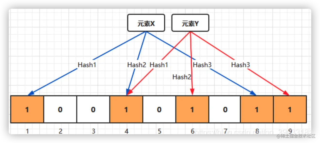 假设,我们要判断元素Z,此时通过计算哈希返回 1,4,5 的话,发现其中 5 为 0,就可以判断 元素 Z 不存在此容器中。