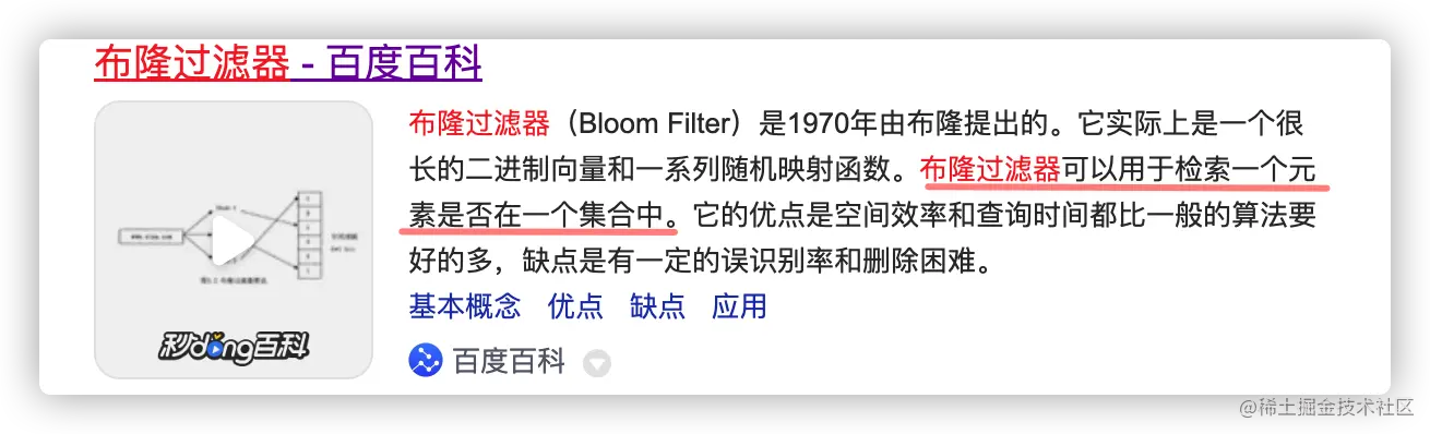 百度百科解释他可以判断一个元素是否在集合中,后面还说了他的效率呀什么的都很好,那既然如此,我们再想象一下为什么需要它!