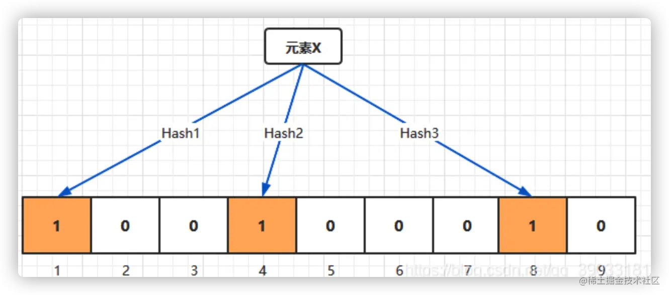 我们假如二进制向量的长度为9,散列函数的个数为3的布隆过滤器,针对元素X,三个不同的散列函数分别生成的哈希值为1,4,8。则上图转变为: