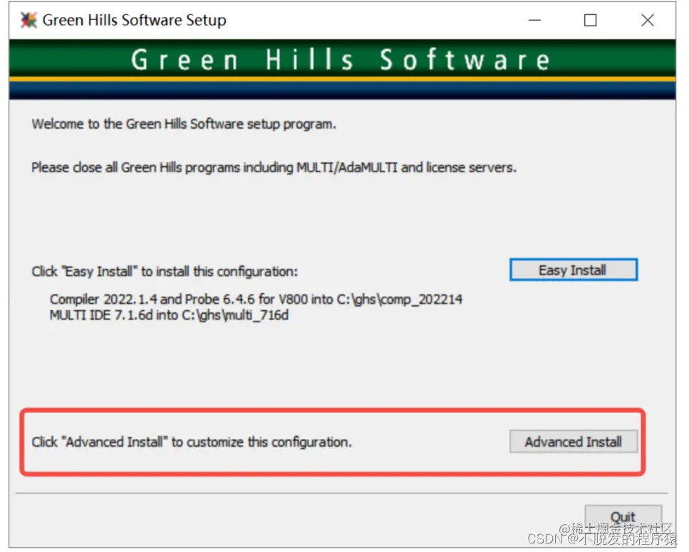从官方购买的软件光盘中拷贝出Green Hills Software安装包,并解压进行安装,这里我使用高级自定义安装,如下图所示: