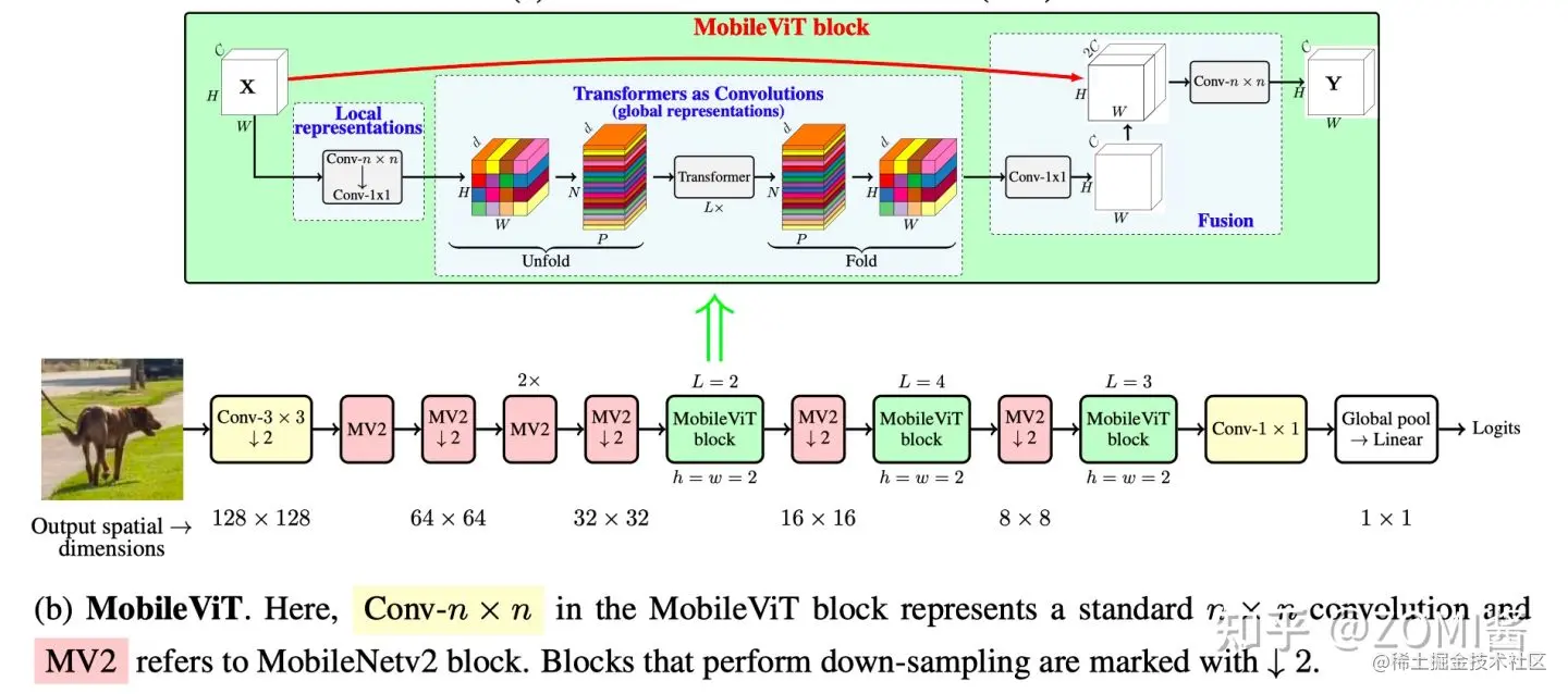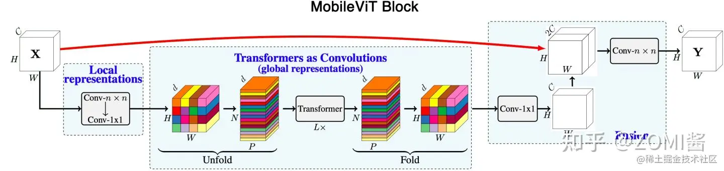 MobileViT 引入了 MobileViT block,它可以有效地将局部和全局信息进行编码。与ViT 及其变体不同,MobileViT 从不同的角度学习全局表示。标准卷积涉及三个操作:展开(unfloading) 、局部处理(local processing) 和展开(folding)。MobileViT 块使用 Transformer 将卷积中的局部建模替换为全局建模。这使得MobileViT 块具有 CNN 和 ViT 的性质,有助于它用更少的参数和简单的训练方式学习更好的表示。一句话来说,就是: