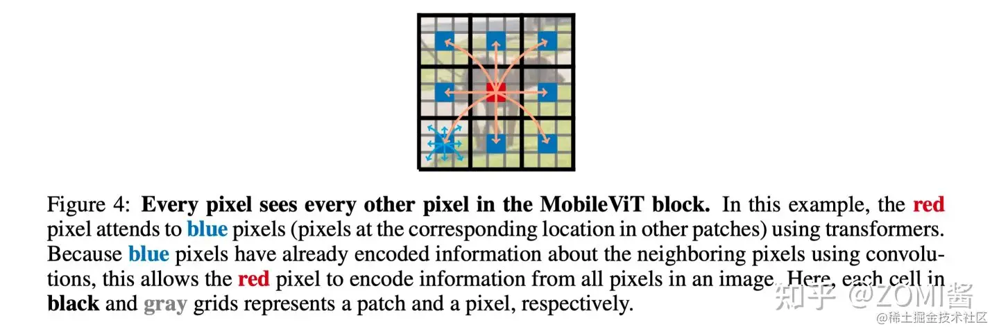 在MobileViT Block中,每个像素都可以感知到其他像素。图中,黑色和灰色网格中的每个单元分别表示一个patch和一个像素。红色像素通过transformer处理蓝色像素(其他patch中相应位置的像素)。因为蓝色像素已经使用卷积对邻近像素的信息进行了编码,这就允许红色像素对图像中所有像素的信息进行编码。