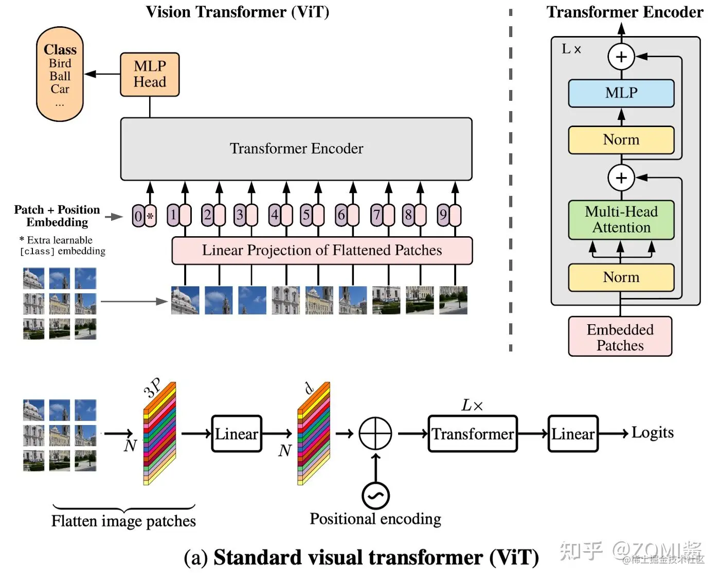 一个标准的 ViT 模型将输入 reshape 为 patches,将其投影到固定的 D 维空间,然后使用 L 个 transformer block 学习 patches 之间的表征。