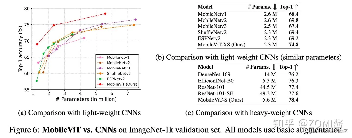 下图(a)示了本文方法和其他轻量级CNN网络的对比,可以看出 MobileViT 模型精度的优越性。(b)对比了本文方法和其他轻量级网络在相似参数量下的性能对比,MobileViT 具有更高的性能。(c)展示了本文方法和 heavy-weight CNN的对比,MobileViT 可以用更少的参数,达到更高的准确率。