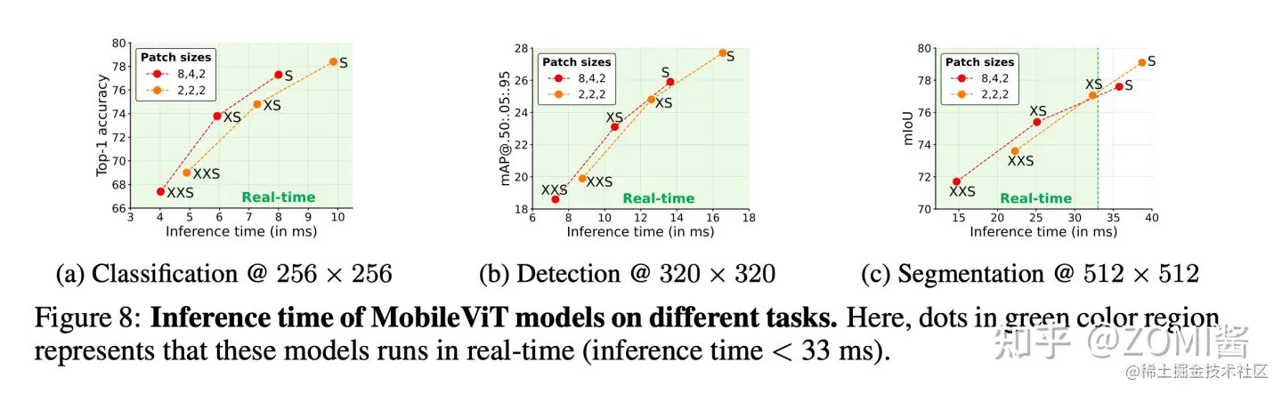 下面展示了 MobileViT 在语义分割任务/分类任务/检测任务,基于不同主干网络的DeepLabv3 性能和参数对比,可以看出,本文的方法在各种轻量级网络中,能够达到更高的性能。并且推理性能还能够做到实时 33ms 以内啦。
