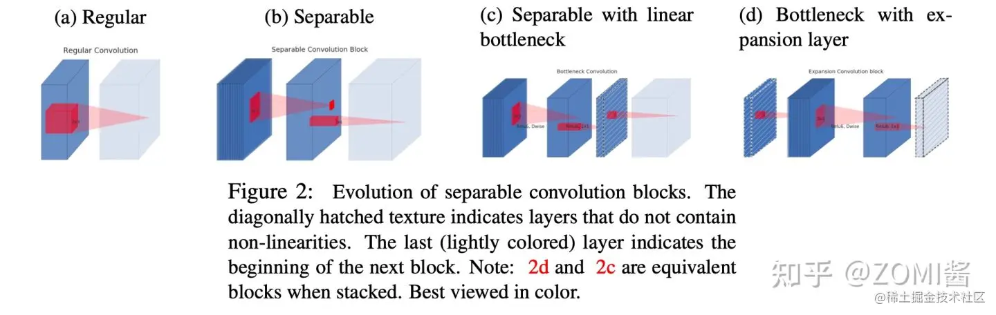 图(a)是常规的卷积,而图(b)是 Depthwise Separable Convolution,在MobileNetv1 中大量使用。当在 Depthwise Separable Convolution 后面加入 bottlenck layer 就变成了图(c),但是考虑到block是互相堆积的,调整一下视角,如果将 bottlenck layer 看成 block 的输入,那么这种结构也等价于图(d)。