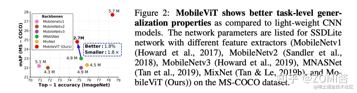 - 更好的性能:在相同的参数情况下,与现有的轻量级CNN相比,MobileViT 模型在不同的移动视觉任务中实现了更好的精度。