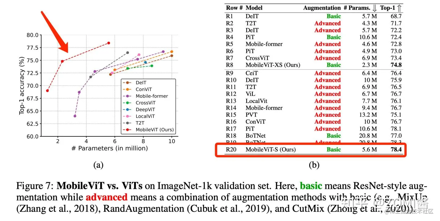 下面还对比了 MobileViT 和 ViT 结构的的参数量和性能,可以看出,MobileViT 可以用更少的参数、更简单的数据增强,达到更高的性能。图中比较了 MobileViT 和在ImageNet-1k 数据集上从头开始训练的ViT变体(DeIT、T2T、PVT、CAIT、DeepViT、CeiT、CrossViT、LocalViT、PiT、ConViT、ViL、BoTNet和Mobile-former)。