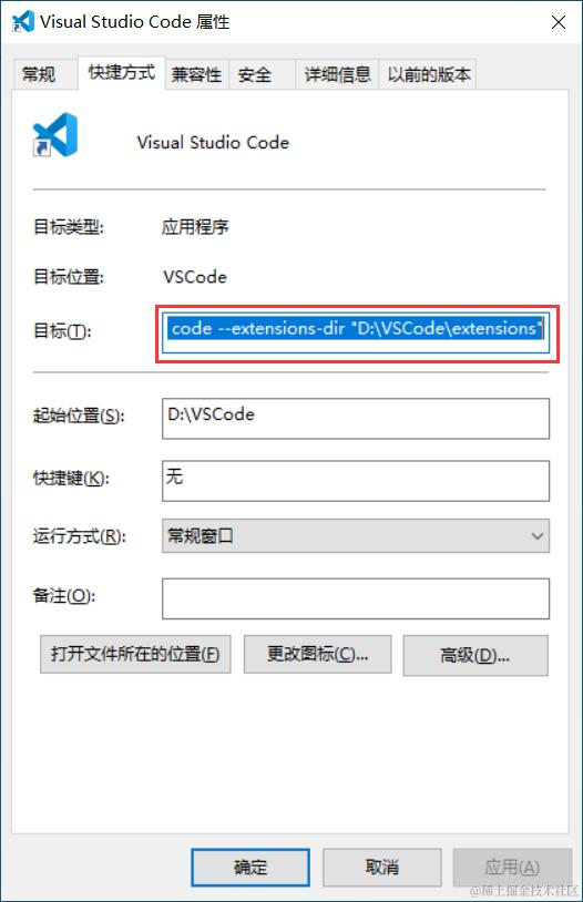 打开vscode的属性,在目标位置追加输入code --exensions-dir 存放路径,我的是输入这个
