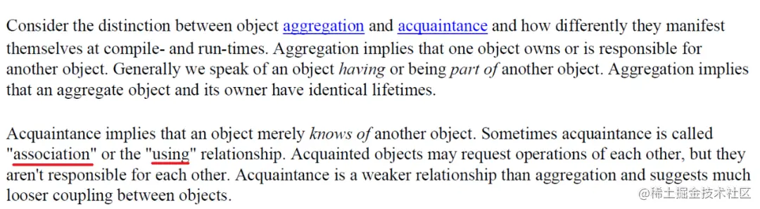 如图8-130,在GoF《设计模式》中,给出这句话之后,作者接下来讨论了aggregation(聚合)和acquaintance(认识)的区别,并且说acquaintance有时也被称为association(关联)或using(使用)。然而,在后面的内容中,作者把这几个词全部抛弃,一律使用composition。