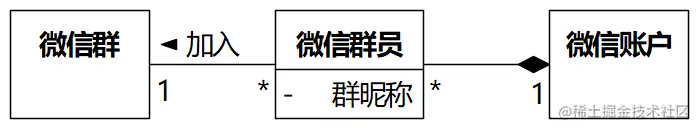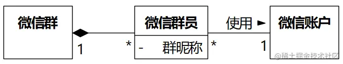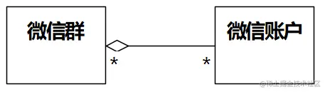 含义模糊的聚合如图8-122。“微信群有微信账户”,而且微信群解散,微信账户还在,所以把“微信群”和“微信账户”之间的关联设为聚合,多重性为多对多。