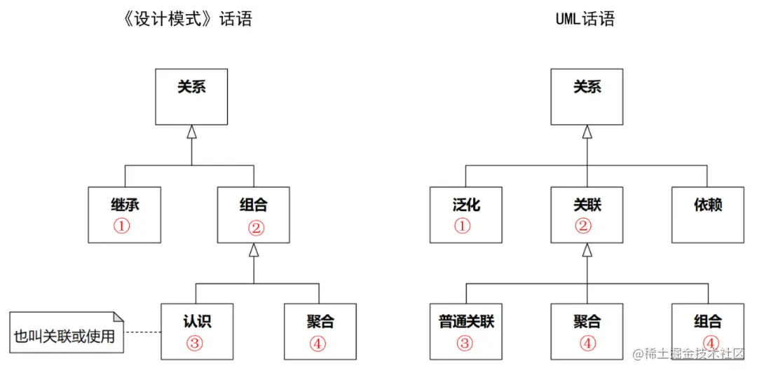 根据GoF书中内容猜测,其中用词和UML以及本书的用词的对应关系可能如图8-131。左右对应为:①继承=泛化;②组合≈关联;③认识≈普通关联;④聚合≈聚合+组合。