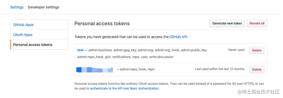 token 的使用有一个非常经典的场景,就是在 github 中的使用。在 github->settings->Developer settings->Personal access tokens 中,可以生成一个 token 用于访问 github 的 api,这个 token 是没有时效性的,“任何人”可以使用它们代替通过 HTTPS 的 Git 密码,也可以用来通过基本身份验证向 API 进行身份验证。