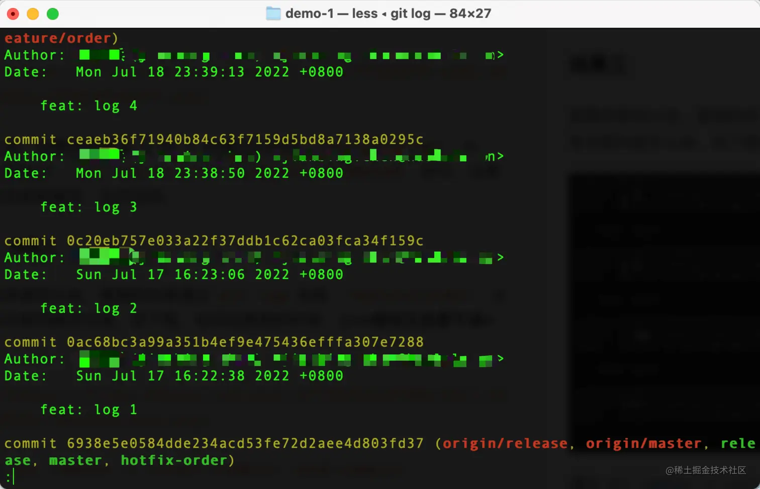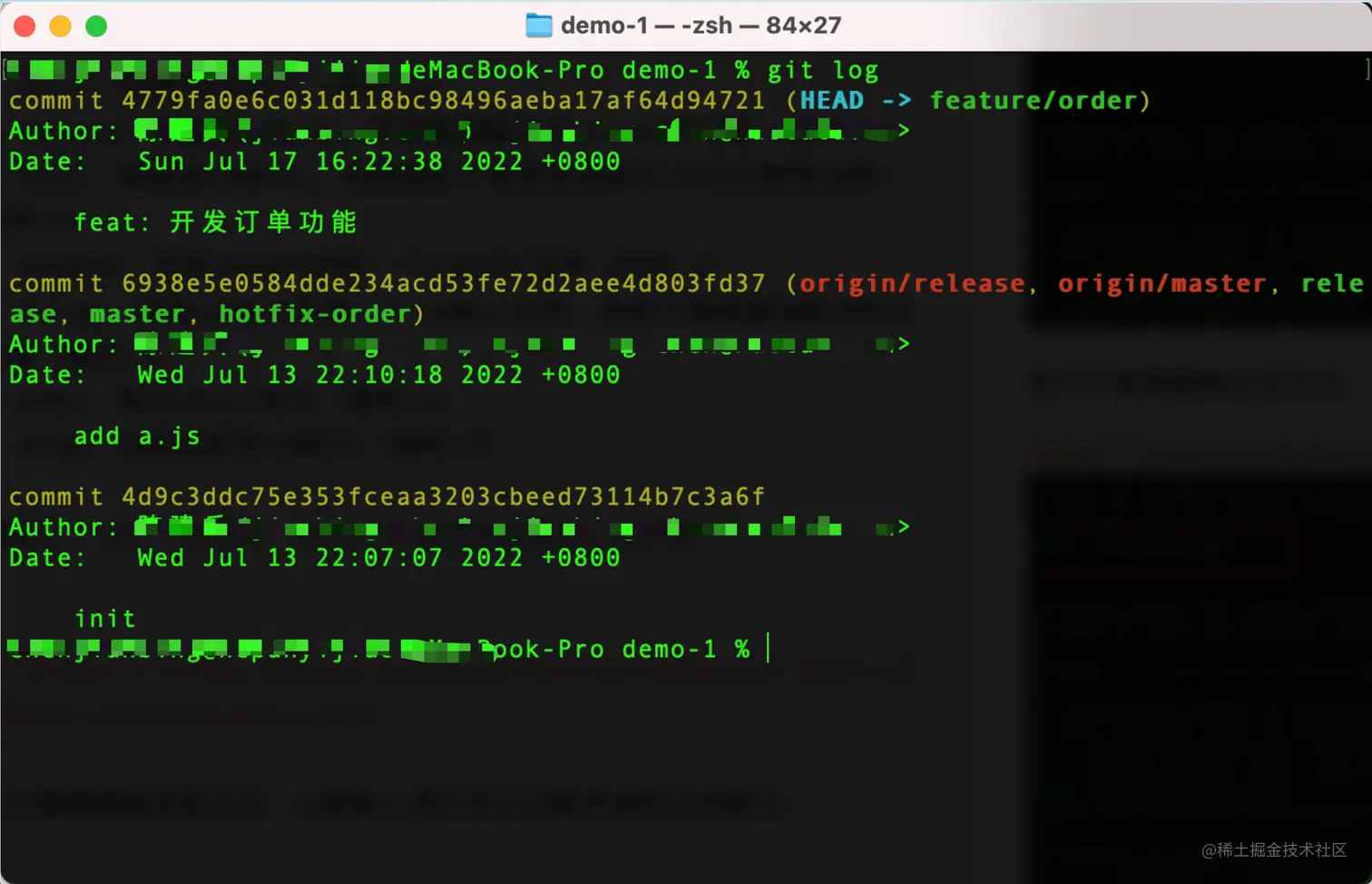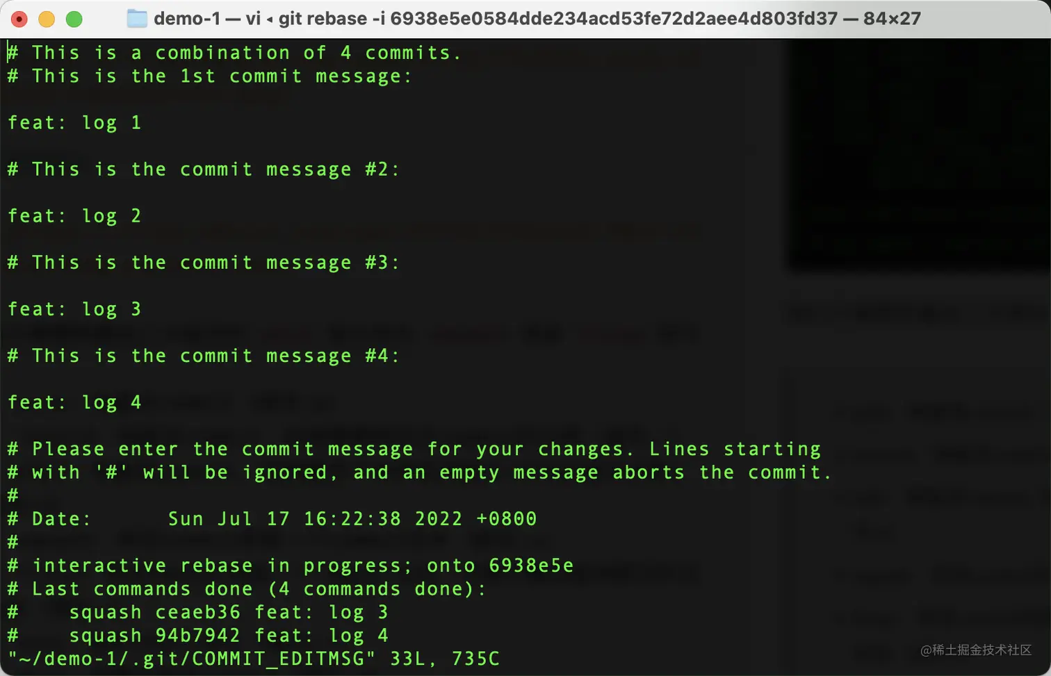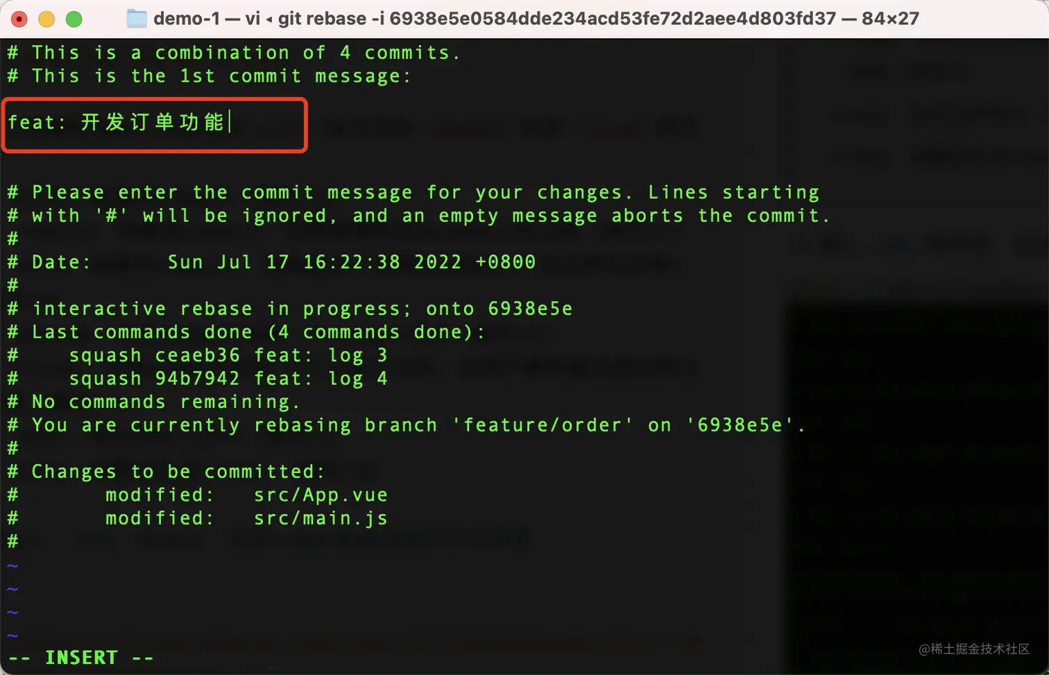 某需求做完以后,提测的时候通过 git log 发现 feature/order 分支有无数的提交记录,如下图,如何在提测的时候,让提交日志更干净?