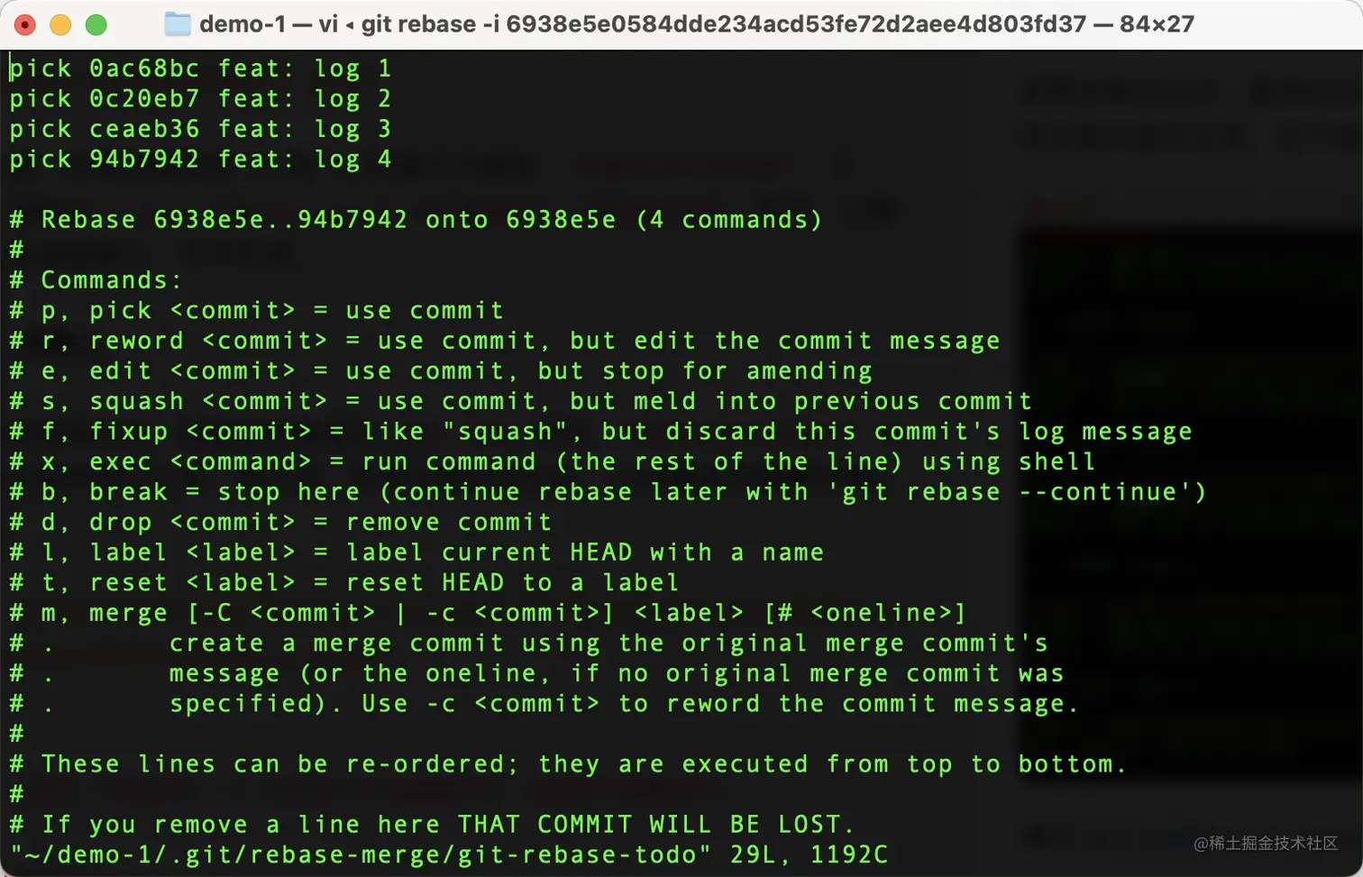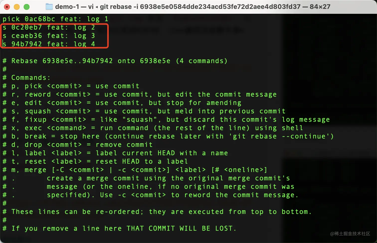 我们只需要把最后三次提交的pick指令改为squash或者fixup即可,更多参数可参考如下: