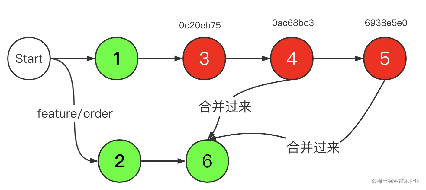如上图,如果想要挑选 4 和 5 的提交代码到 feature/order 分支,则执行:git cherry-pick 0c20eb75..6938e5e0 即可,注意不包含起始提交,左开右闭。