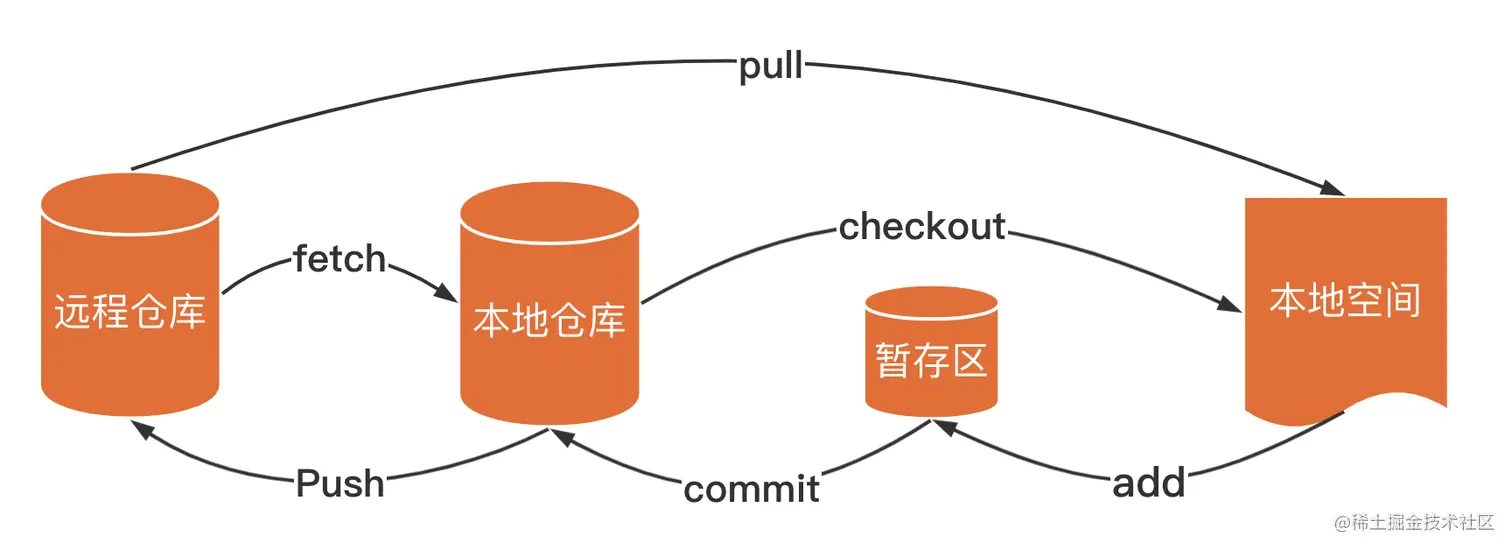 使用 Git 之前先了解 Git 仓库运转流程,共分为4个概念:本地空间、暂存区、本地仓库和远程仓库。如下图:
