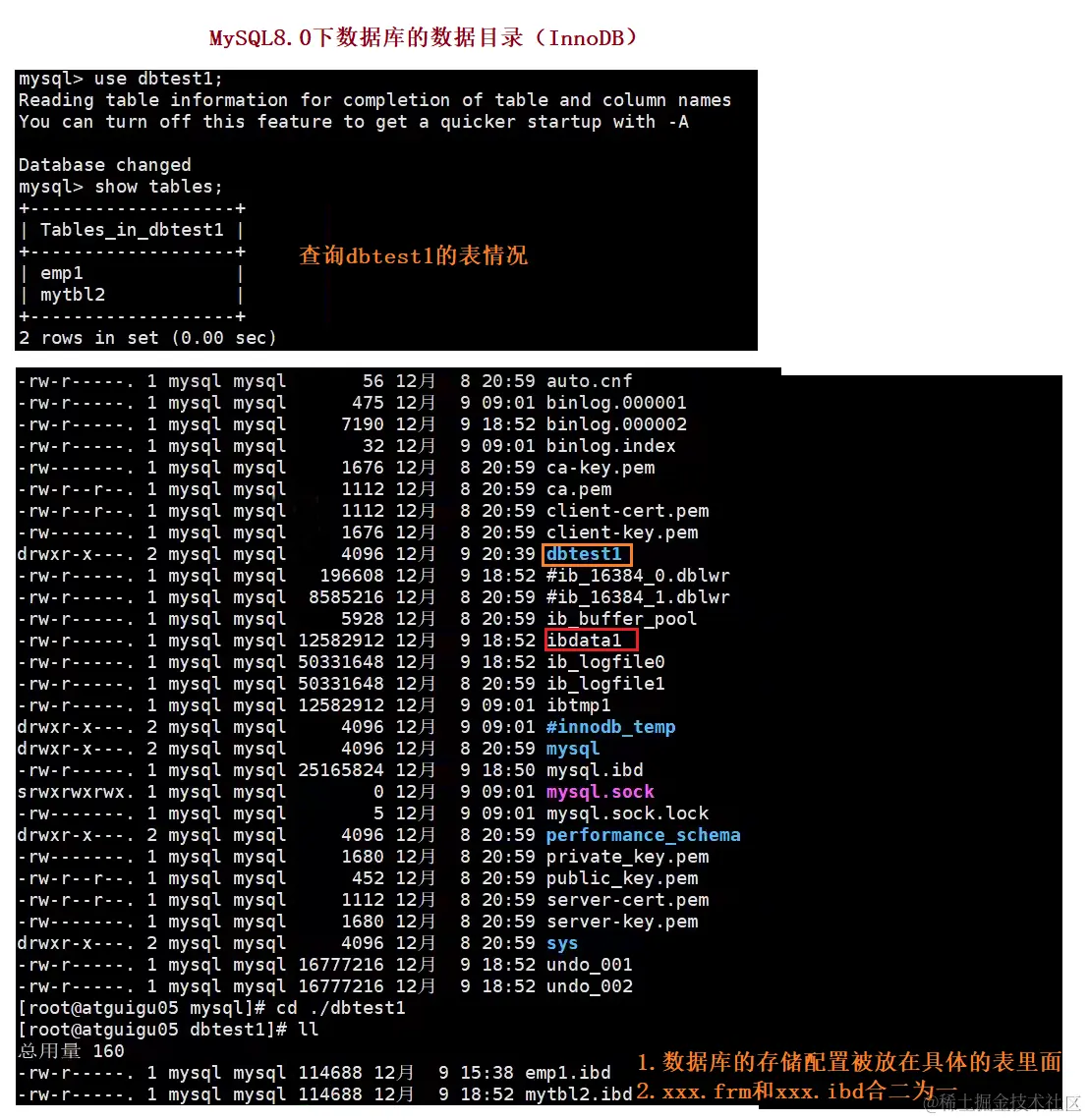 比如:我们使用了 独立表空间 去存储test数据库下的 test 表的话,那么在该表所在数据库atguigu对应的 test 目录下会为 test 表创建这两个文件: