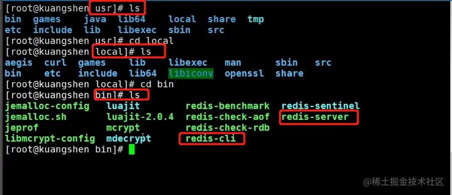 安装好后的默认路径为:/usr/local/bin,进入后可以看到 redis-cli、redis-server 等内容。