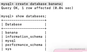 5.创建mysql数据库命令:mysql> create database banana;