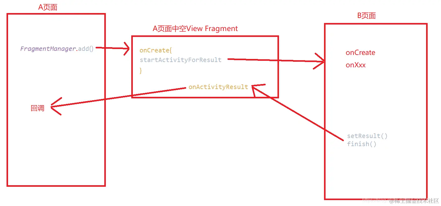 3.B调用了finish,且A页面和Fragment都被销毁了,这时我们可以在onSaveInstanceState中将A的Class保存起来,然后在重建后的onCreate中获取Class对象,然后通过获取的Class对象在onActivityResult方法中移除回调