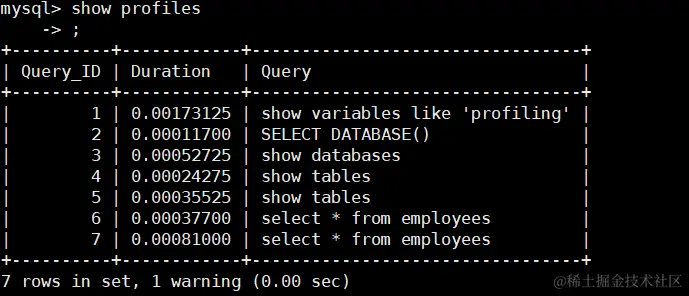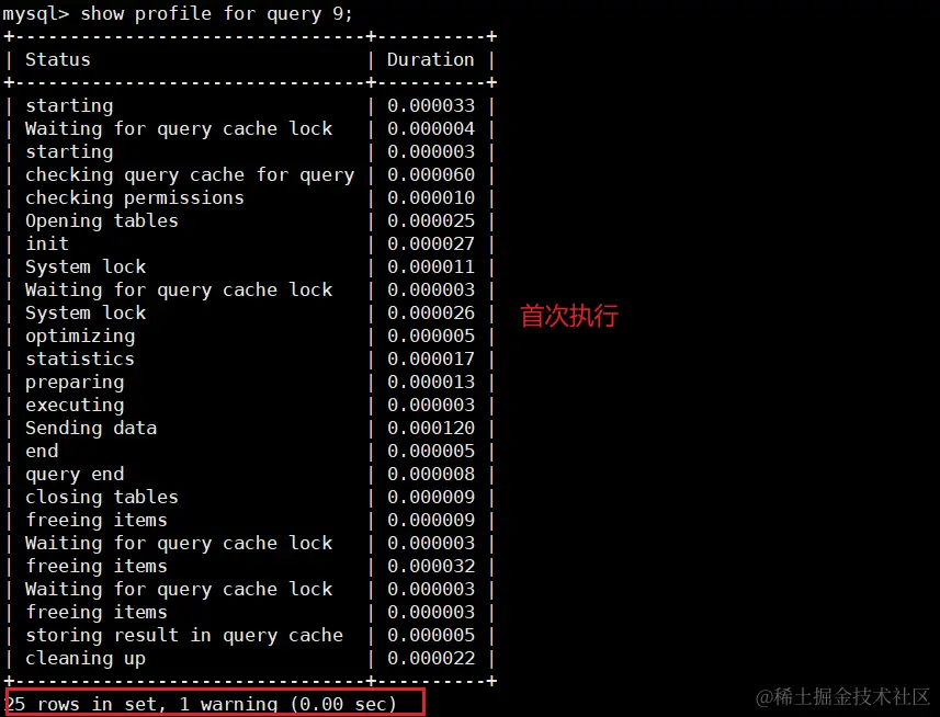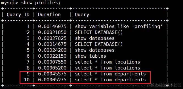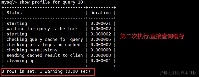 结论不言而喻.执行编号10时,比执行编号9时少了很多信息,从截图中可以看出查询语句直接从缓存中获取数据 .
