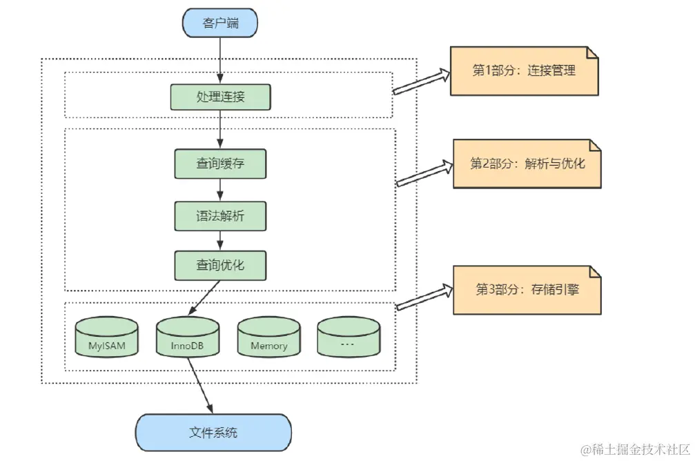 MySQL 架构图本节开篇所示。下面为了熟悉 SQL 执行流程方便,我们可以简化如下: