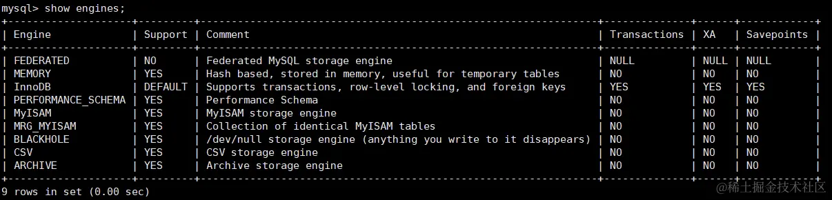 MySQL 8.0.25 默认支持的存储引擎如下: