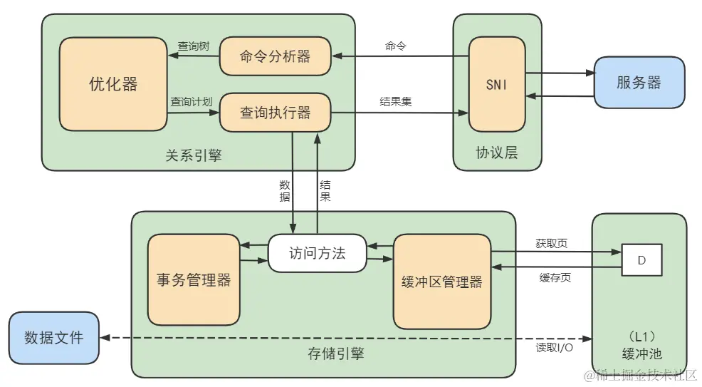 SQL 层(服务层):对 SQL 语句进行查询处理;与数据库文件的存储方式无关;