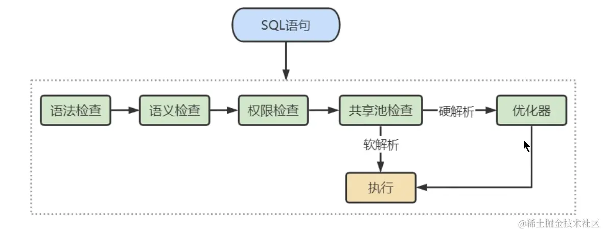 在共享池中,Oracle 首先对SQL语句进行Hash运算,然后根据Hash值在库缓存(Library Cache)中查找,如果存在SQL语句的执行计划,就直接拿来执行,直接进入“执行器”的环节,这就是软解析。