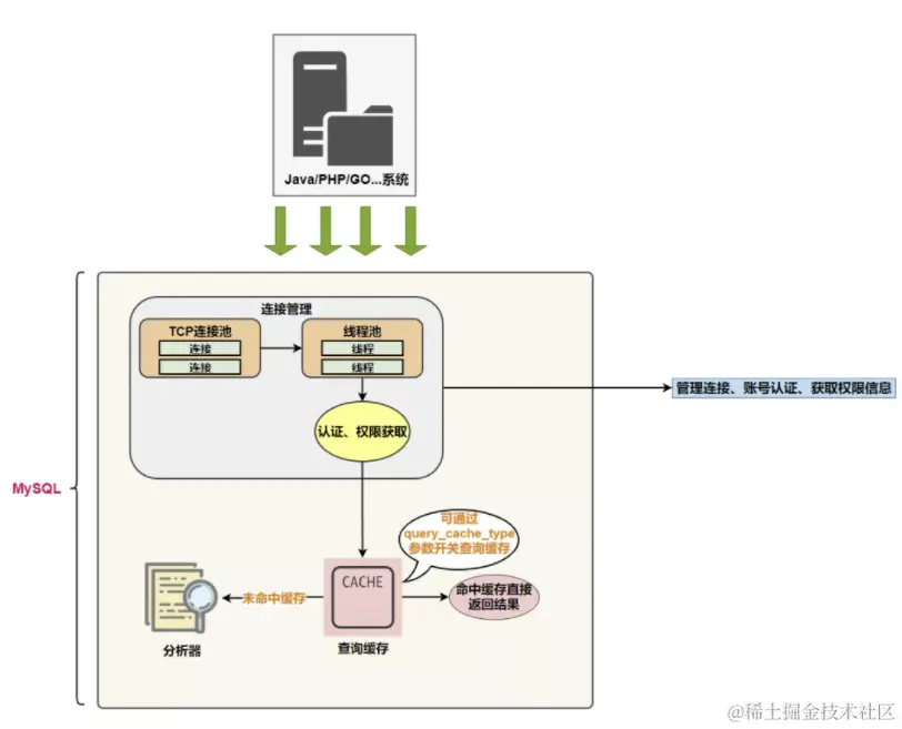 MySQL内部维持着一些 Cache 和 Buffer,比如 Query Cache 用来缓存一条 SELECT 语句的执行结果,如果能够在其中找到对应的查询结果,那么就不必再进行查询解析、优化和执行的整个过程了,直接将结果反馈给客户端。