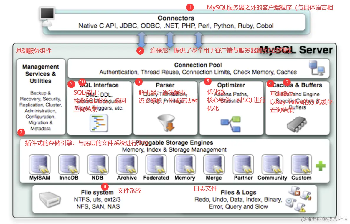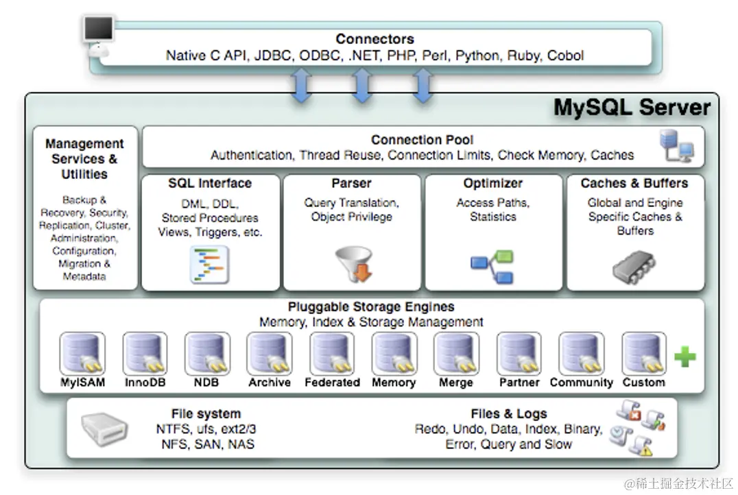 Connectors指的是不同语言中与SQL的交互。MySQL首先是一 个网络程序,在TCP之上定义了自己的应用层协议。所以要使用MySQL,我们可以编写代码,跟MySQL Server建立TCP连接,之后按照其定义好的协议进行交互。或者比较方便的办法是调用SDK,比如Native C API、JDBC、 PHP等各语 言MySQL Connector,或者通过ODBC。 但通过SDK来访问MySQL,本质上还是在TCP连接上通过MySQL协议跟MySQL进行交互。