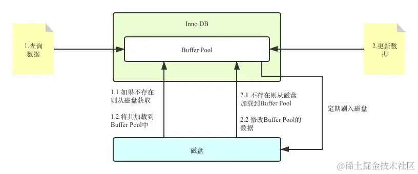 当我们查询数据的时候,会先去Buffer Pool中查询。如果Buffer Pool中不存在,存储弓|擎会先将数据从磁盘加载到Buffer Pool中,然后将数据返回给客户端;同理,当我们更新某个数据的时候,如果这个数据不存在于Buffer Pool,同样会先数据加载进来,然后修改修改内存的数据。被修改过的数据会在之后统一刷入磁盘。