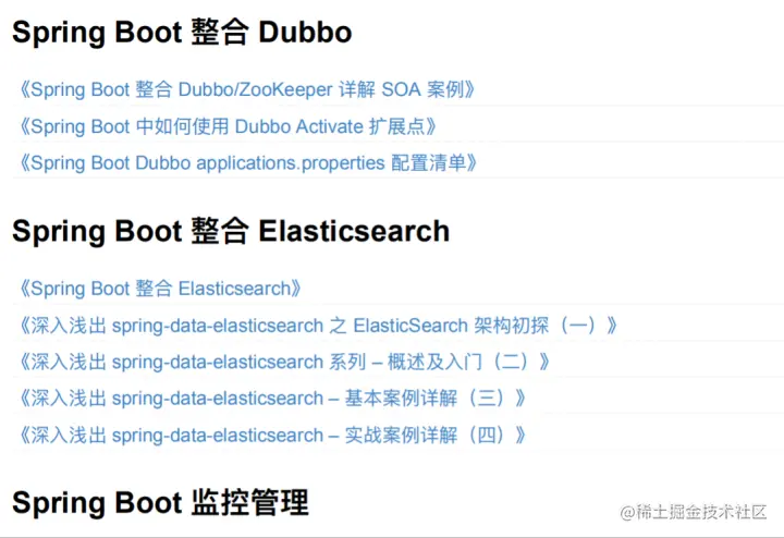 七、Spring Boot 监控管理 如何用 Spring 构建系统安全层、系统监控层?如何测试 Spring 应用程序?这部分详细介绍通过 Spring Boot 实现 Web 应用程序的一系列非功能需求,使得这套 Web 开发技术体系更具完备性,内容更加全面。