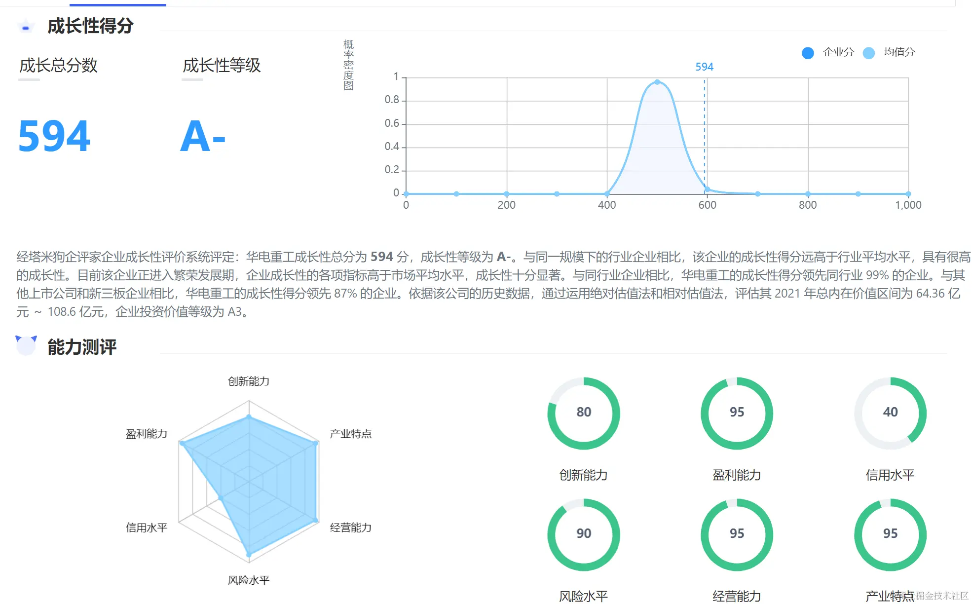 经塔米狗企评家企业成长性评价系统评定:华电重工成长性总分为 594 分,成长性等级为 A-。与同一规模下的行业企业相比,该企业的成长性得分远高于行业平均水平,具有很高的成长性。目前该企业正进入繁荣发展期,企业成长性的各项指标高于市场平均水平,成长性十分显著。与同行业企业相比,华电重工的成长性得分领先同行业 99% 的企业。与其他上市公司和新三板企业相比,华电重工的成长性得分领先 87% 的企业。依据该公司的历史数据,通过运用绝对估值法和相对估值法,评估其 2021 年总内在价值区间为 64.36 亿元 ~ 108.6 亿元,企业投资价值等级为 A3。