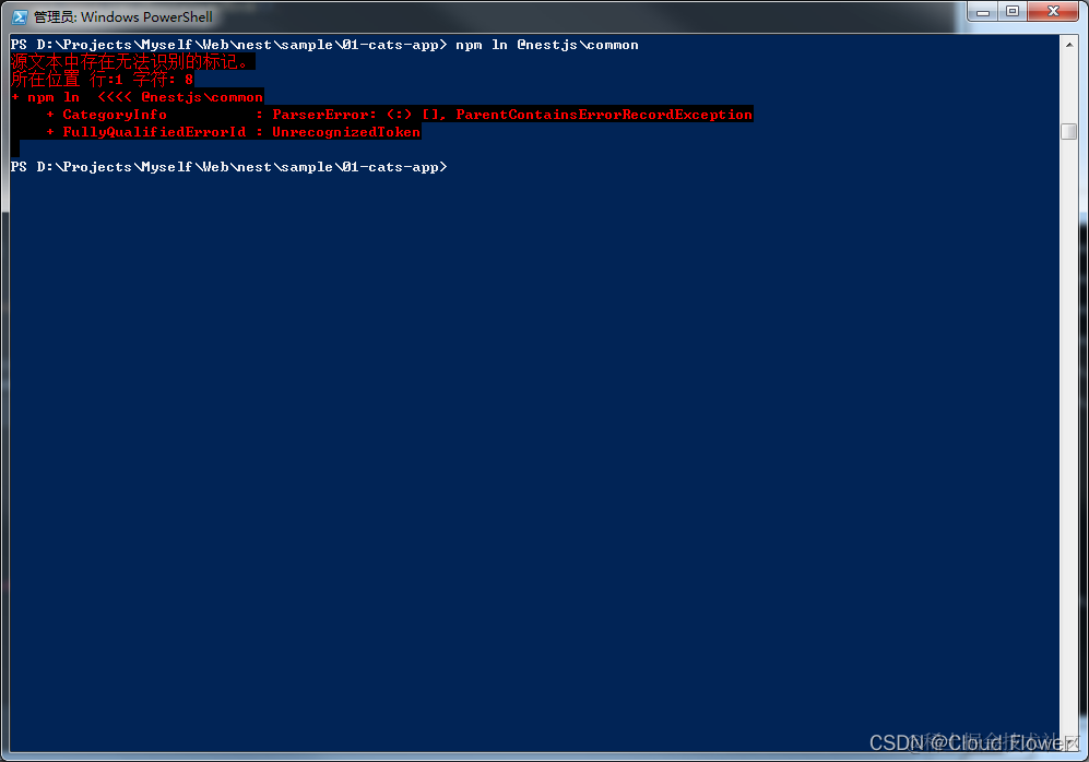 nestjs知识点:win7执行“npm ln @nestjs\common”,报错提示“源文本中存在无法识别的标记 ” 0云卷花开0 2022-07-21 73 阅读1分钟 说明: 如下图 博主在win10没有出现这个情况 解决方案: npm ln '@nestjs\common' (参考:npm(cnpm) 安装报错:源文本中存在无法识别的标记)