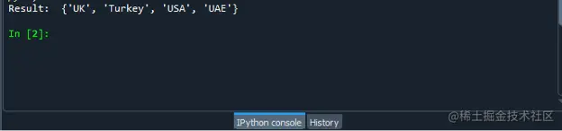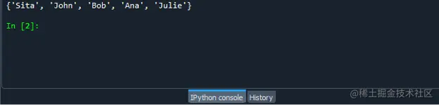 首先,你通过添加值来创建列表。使用 set() 函数将列表转换为一个集合。在这个函数中,你输入你希望转换的列表名称。因此,在这个程序中,我们将 "set(country_names) "分配给一个变量,如 "country_names",以将列表名称转换成一个集合,并使用print()函数显示结果。print函数等同于print(set(country_names))。