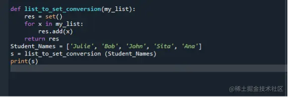 在这个程序中,我们首先定义一个列表,调用set()函数,并将其分配给一个变量。然后我们使用一个for循环,遍历这个列表,并将结果存储在变量中。然后我们创建一个学生的列表。之后,我们使用之前定义的list命令,将 "student_names "列表作为参数传入,并将其赋值给一个变量。然后我们使用print命令,显示转换列表的输出。