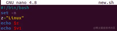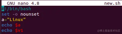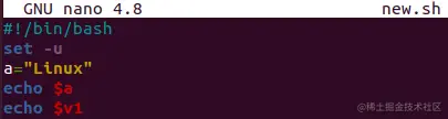 在内置组中,"set -u "命令被用来在遇到任何没有设置值的变量时声明错误。所以,打开文件 "new.sh "来更新代码。添加bash扩展名,并添加set内置 "set -u"。它可以在有函数和无函数的情况下工作。声明一个字符串变量 "a",其值为 "Linux",如图所示。使用echo语句来打印这个变量值。另一个echo语句被用来打印一个未设置的变量 "v1 "的值,如下图所示。