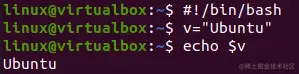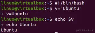 设置为默认值后,让我们在shell中再做一个bash代码。我们已经用 "Ubuntu "这个值初始化了一个字符串变量 "v"。然后,我们试图用 "echo "语句来显示这个变量的值。它只是显示了变量 "v "的输出。