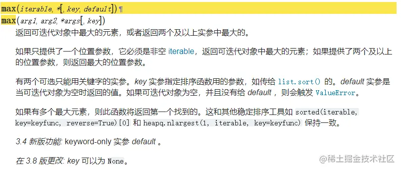 在写下这篇之前,没有去探究max函数的处理逻辑,是通过魔法函数实现比较,还是其他的方式,对此翻了下官方说明。