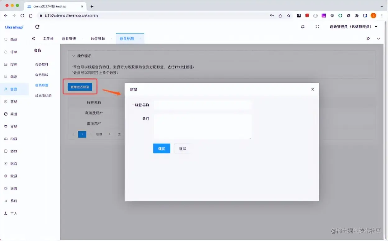 新增会员标签需要填写标签名称,标签备注字段。