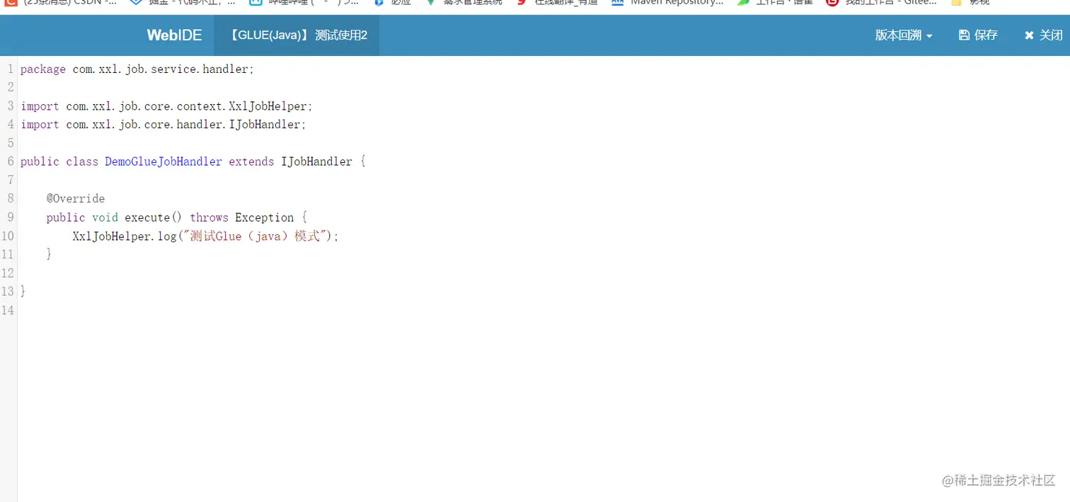 在我们点击操作时,明显发现与Bean模式不同的是多了一个GLUE IDEA。点击进去是一个源码编辑器。