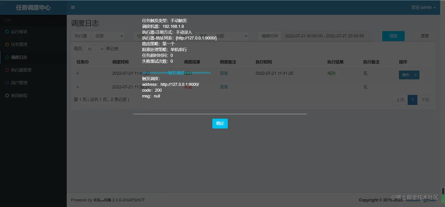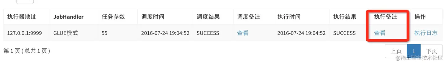 点击保存,返回任务列表,执行一次该任务。执行成功后,在调度日志/操作/执行日志,来查看日志。